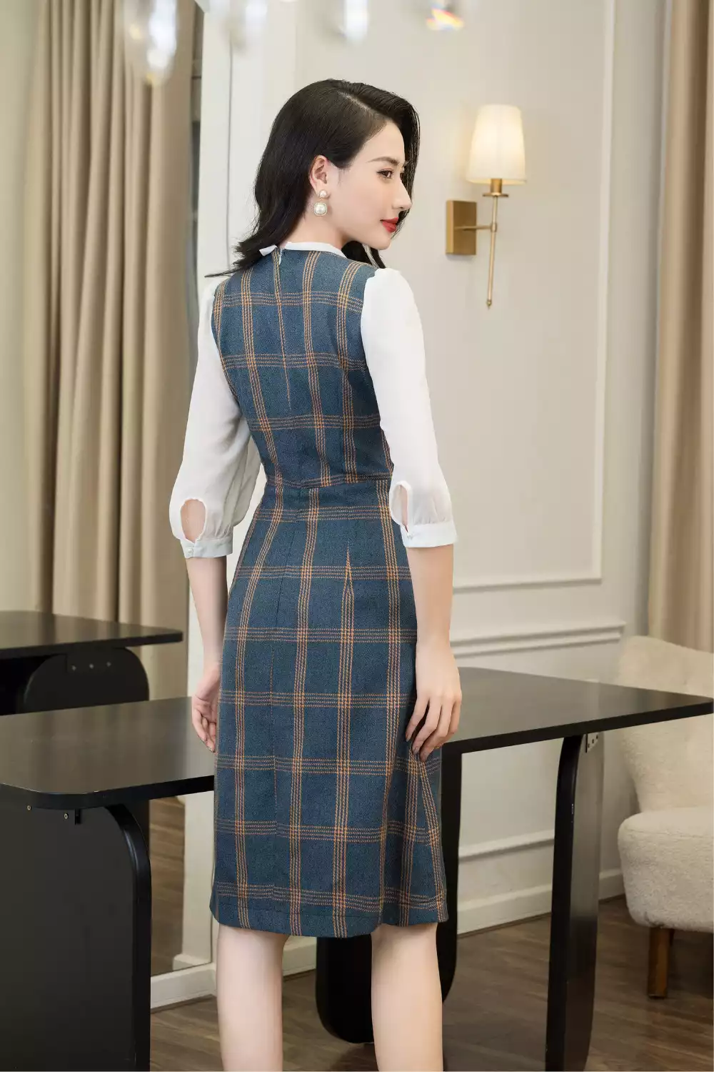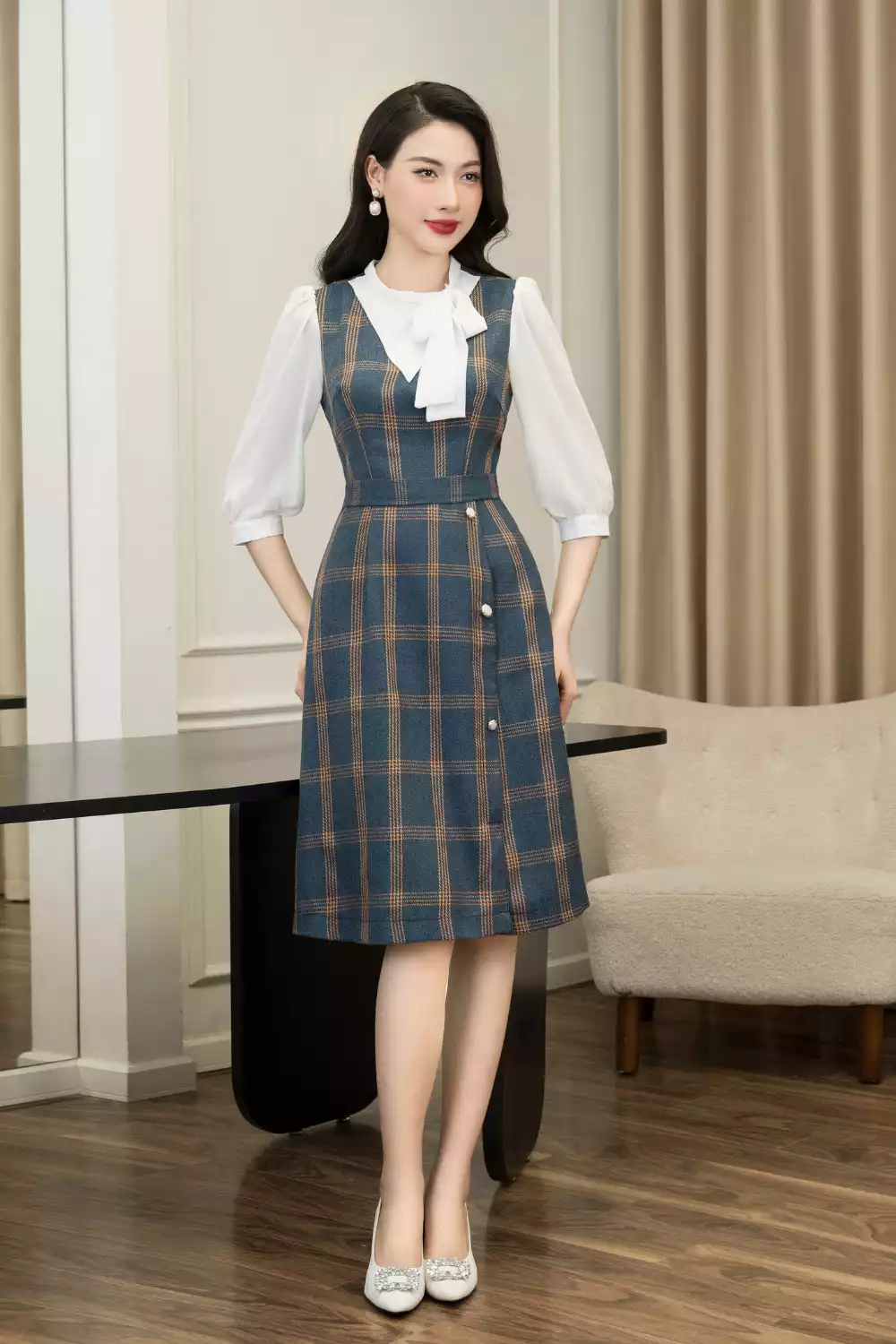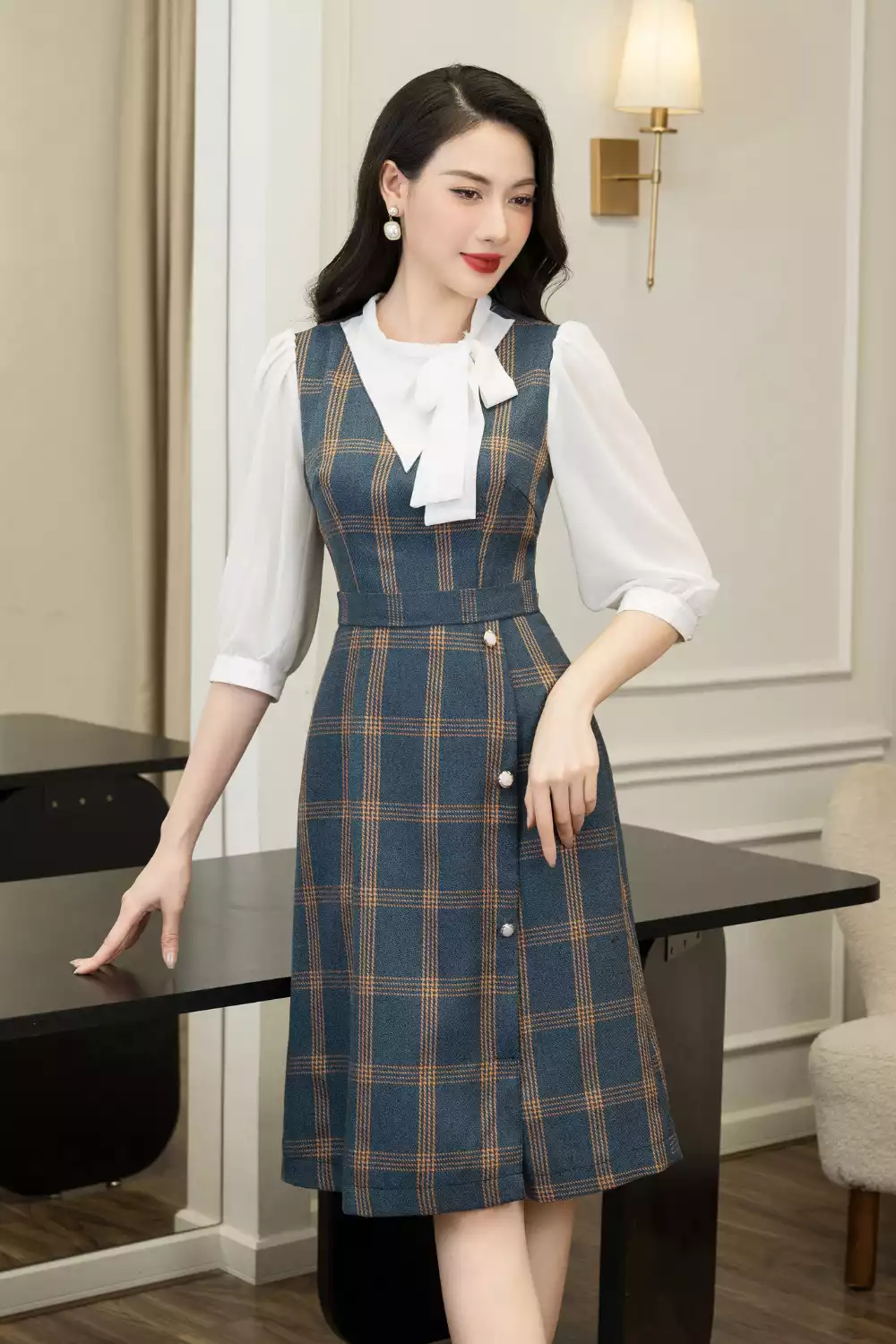 Đầm A dạ tweed kẻ xanh phối tay trắng
