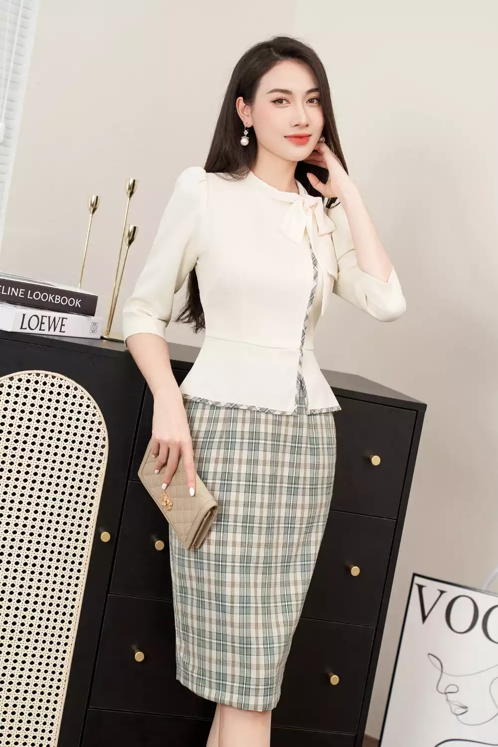 Đầm dạ phối chân kẻ ôm tay dài cổ thắt nơ
