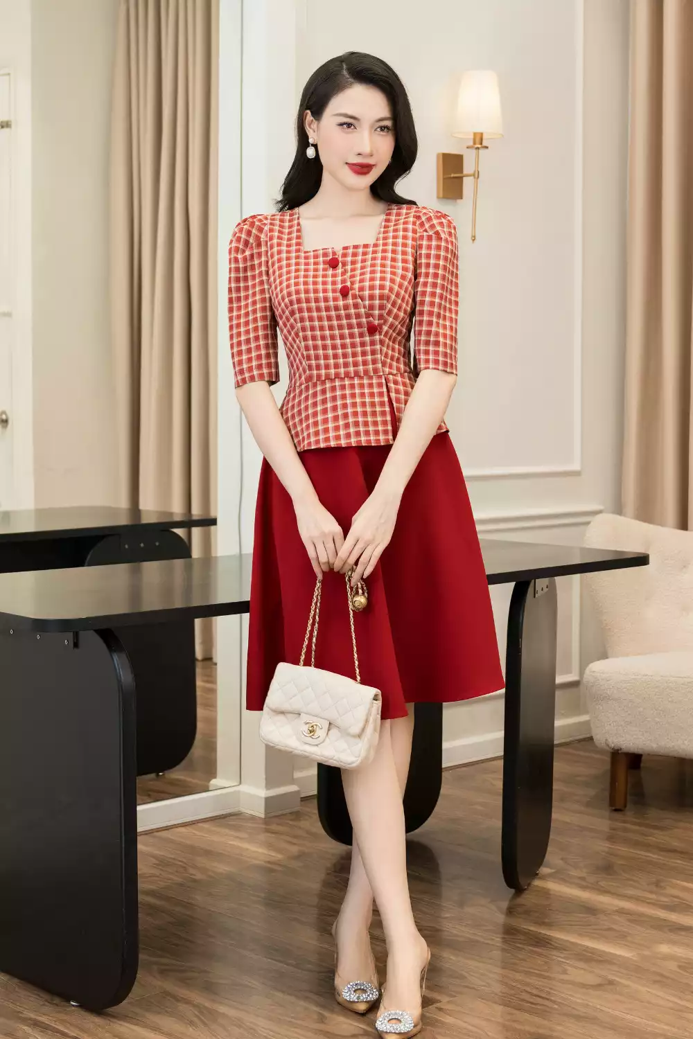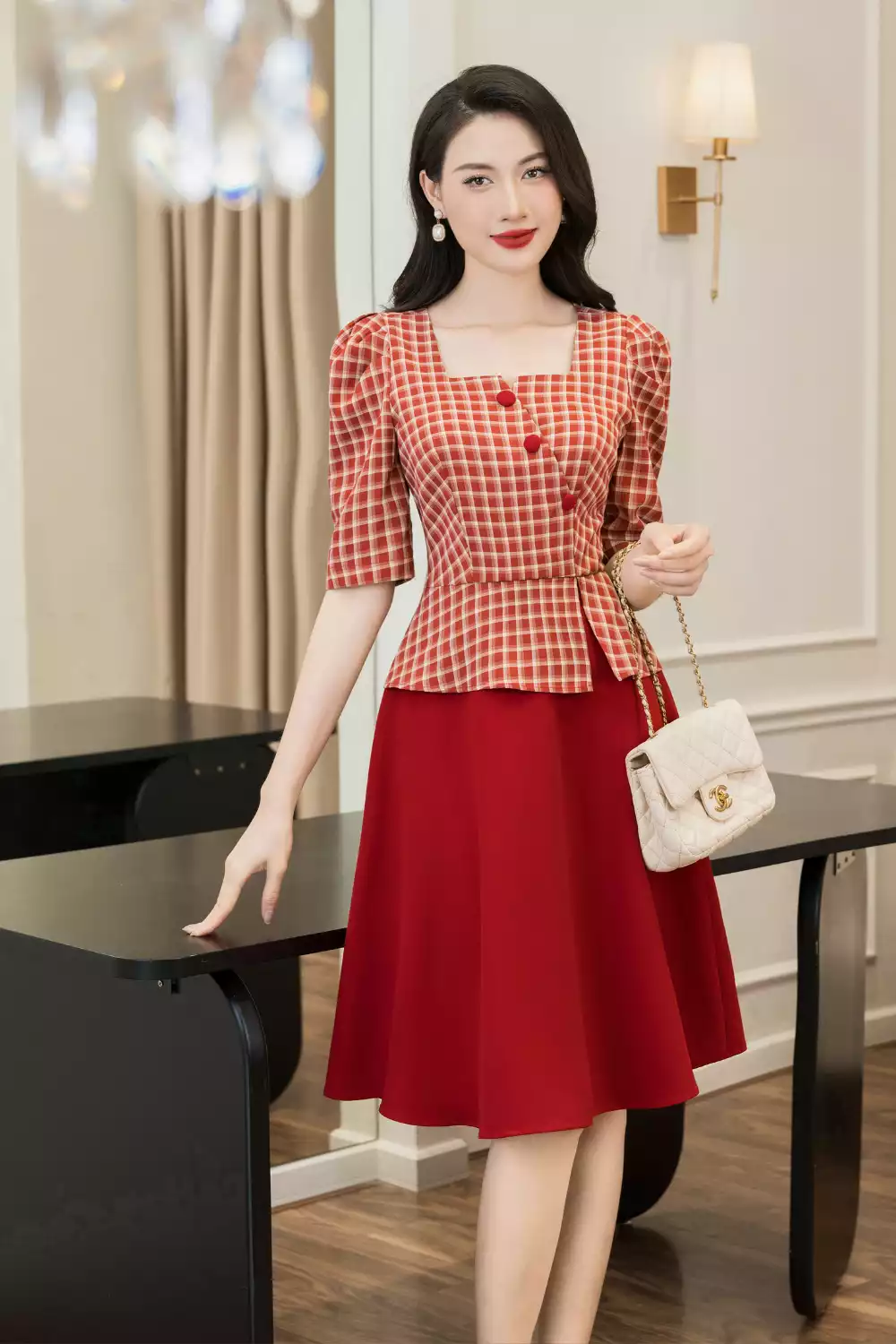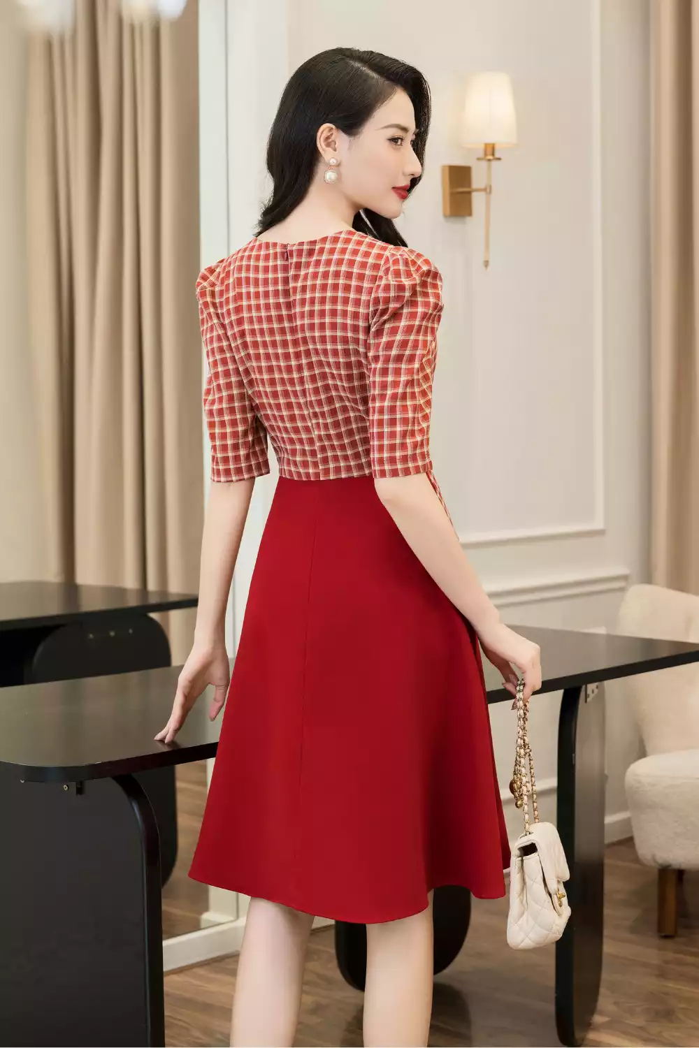 Đầm kẻ đỏ phôi chân 1 màu