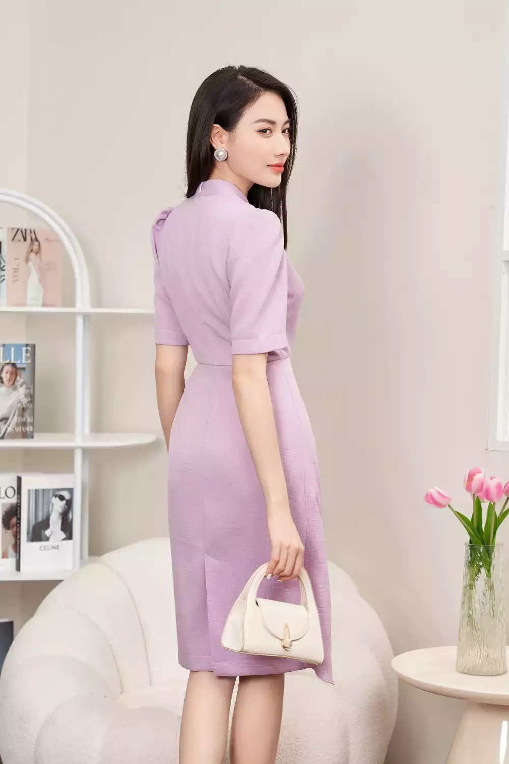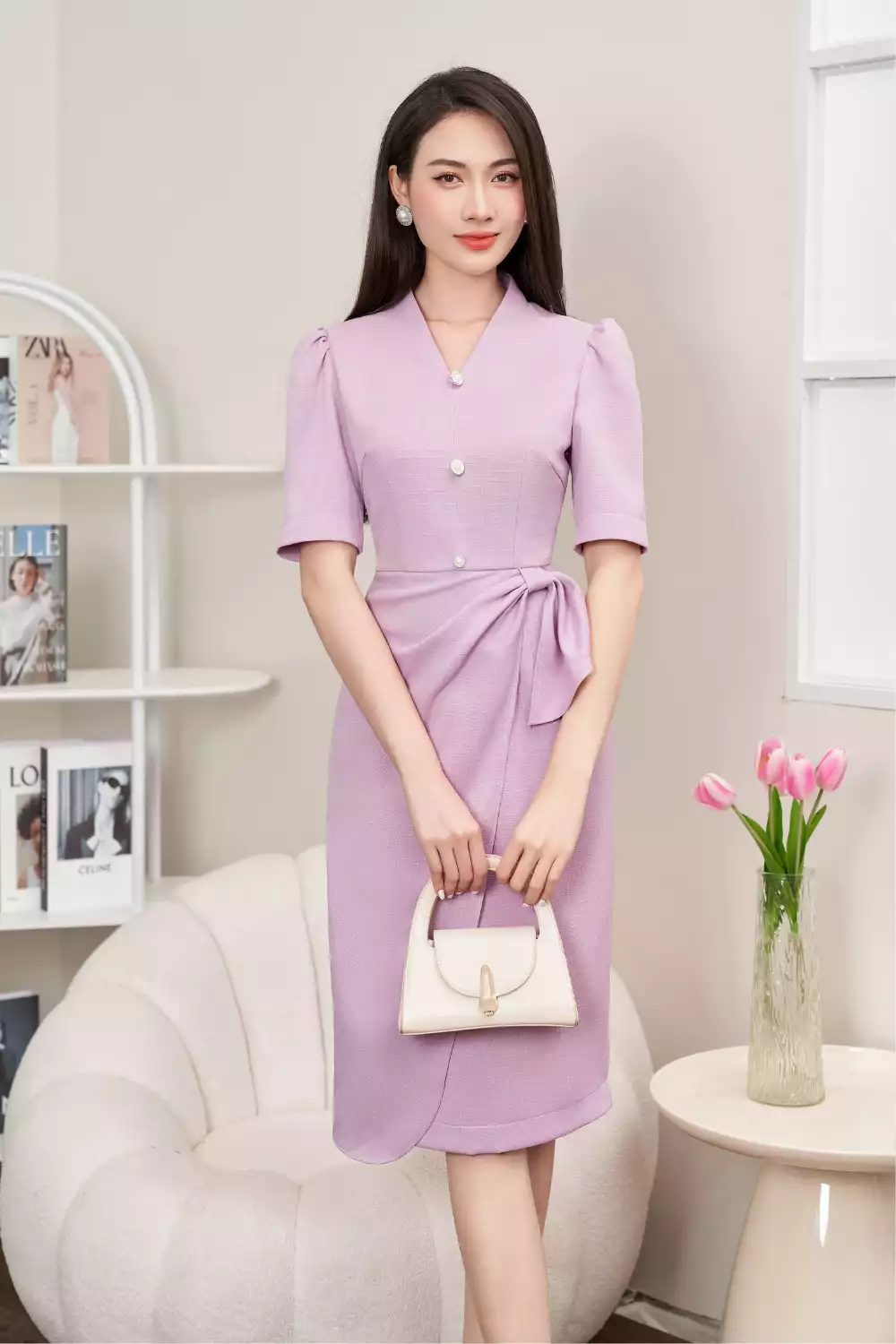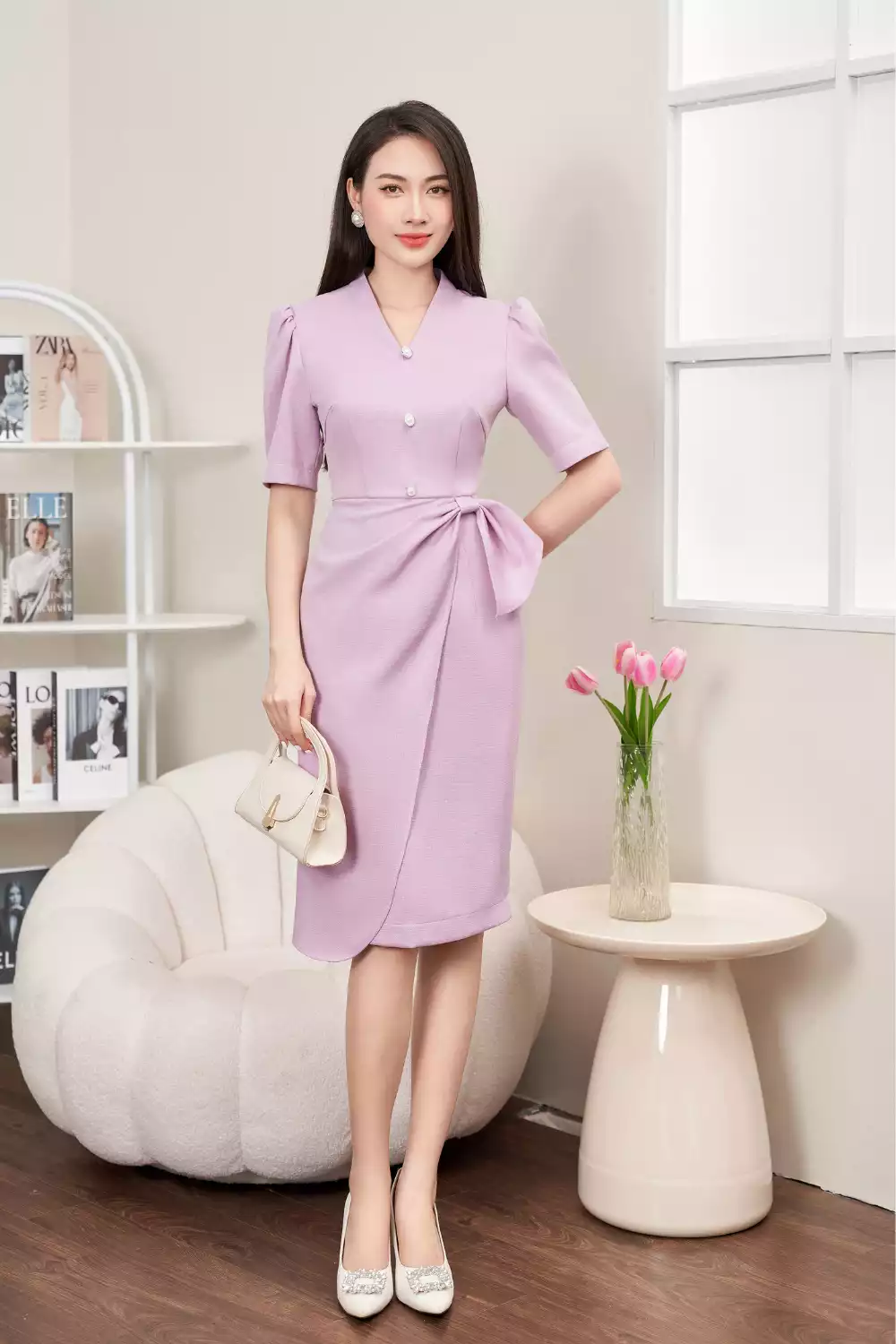Đầm ôm dạ tếch hồng cổ V đính nơ