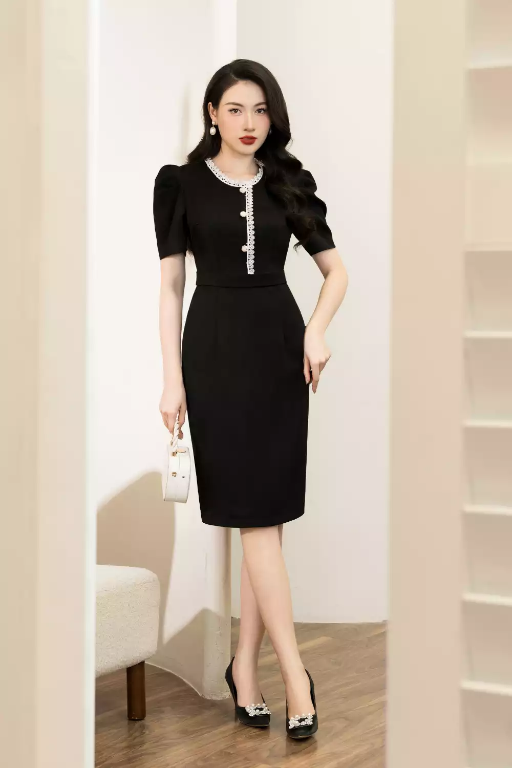 Đầm ôm dạ tweed đen phối viền ren trắng