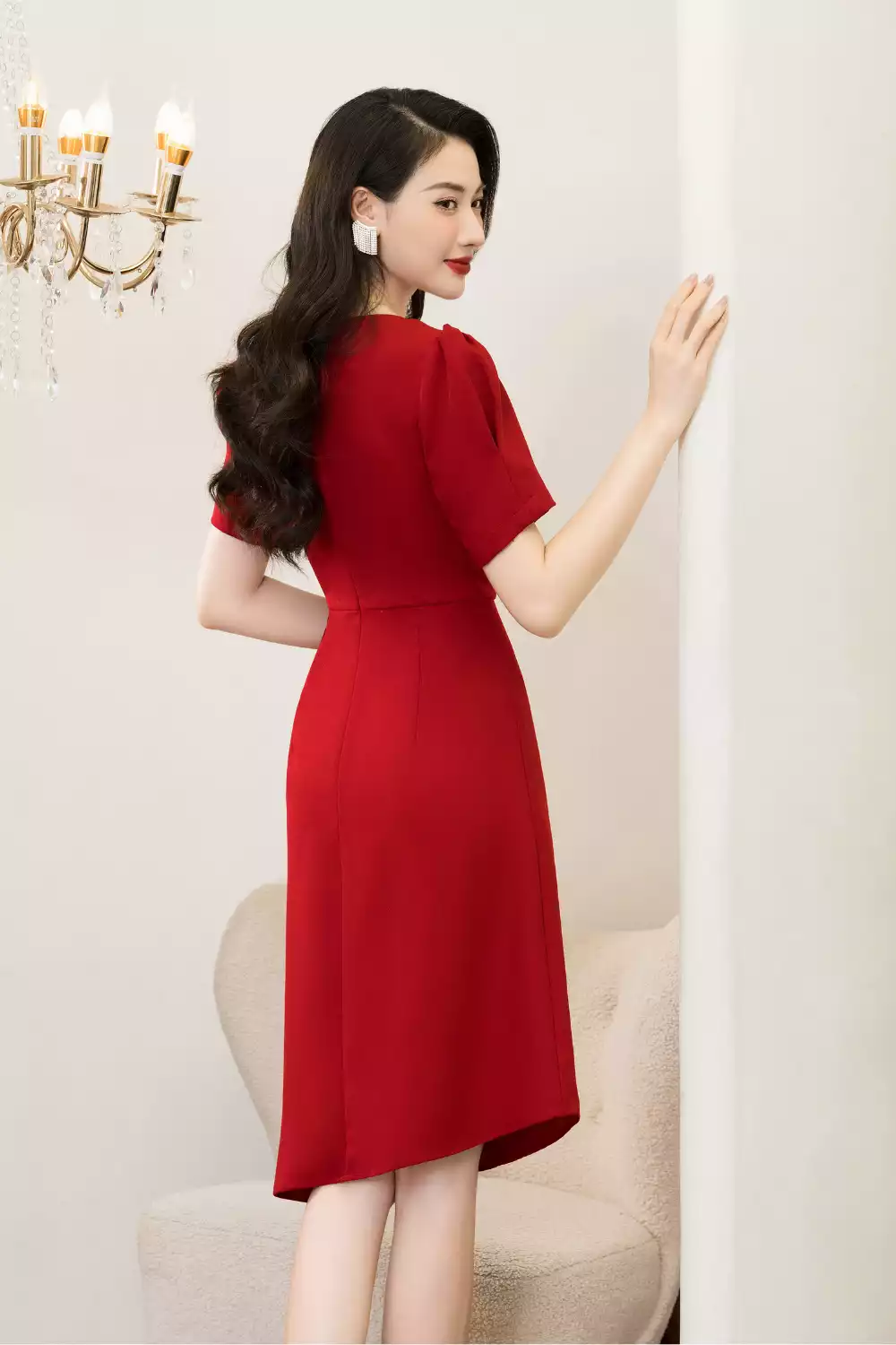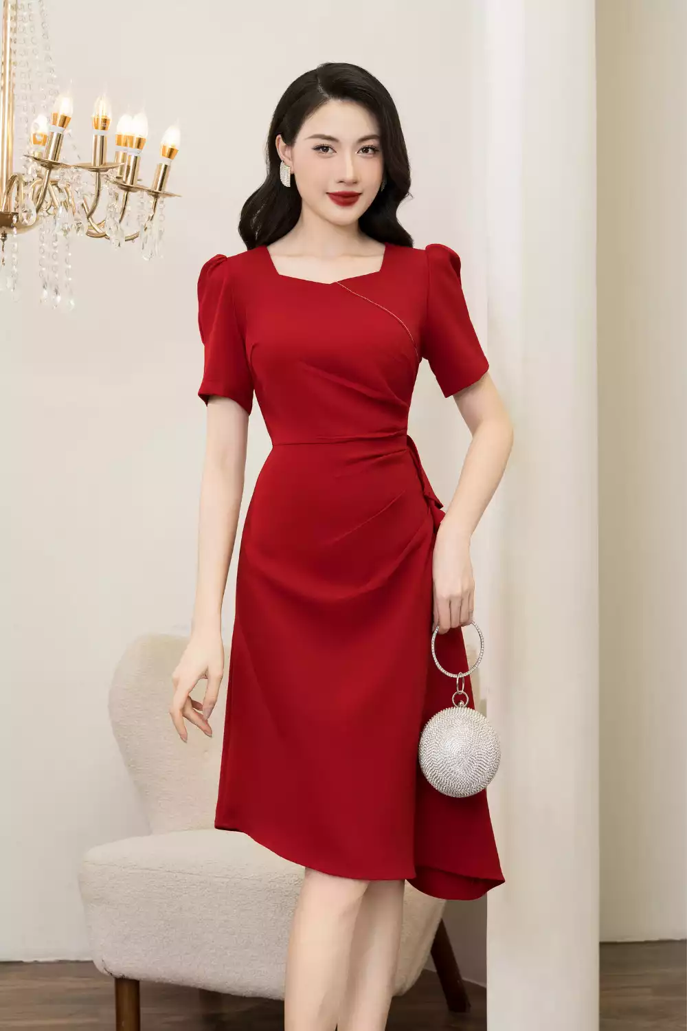 Đầm ôm đỏ 1 màu xếp ly 1 bên