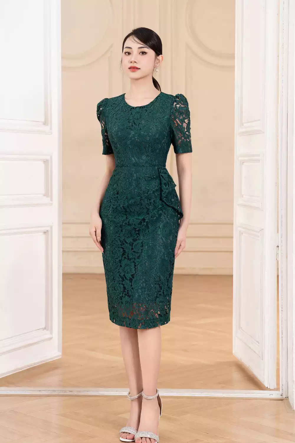 Đầm ôm ren xanh tay lỡ đính hoa eo