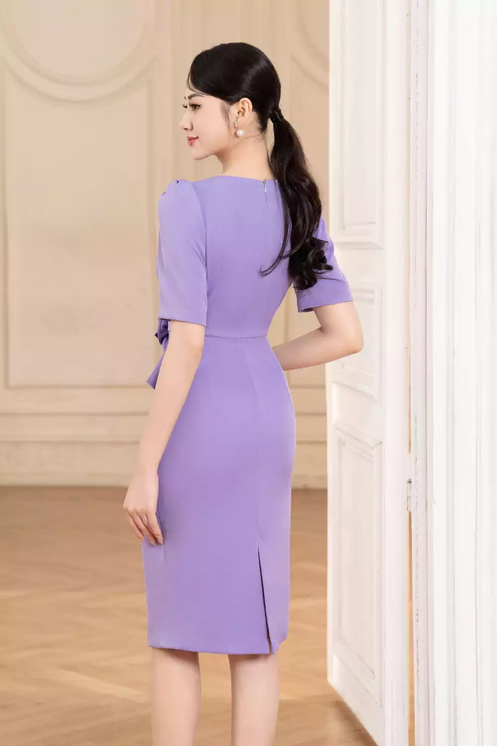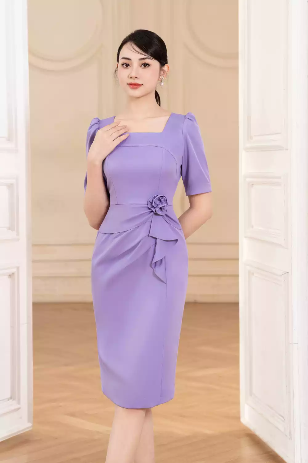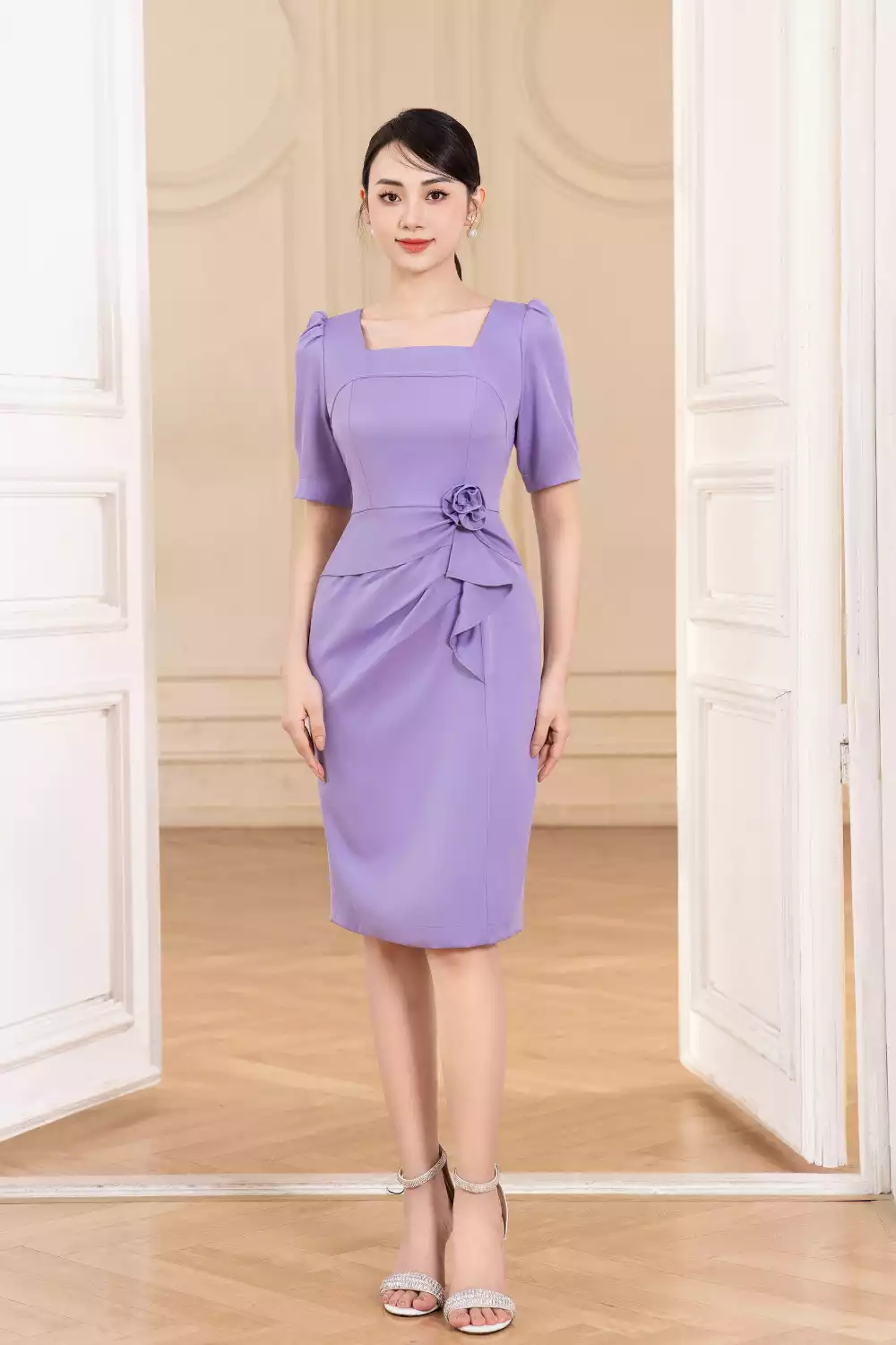 Đầm ôm tím cổ vuông phối eo đính hoa
