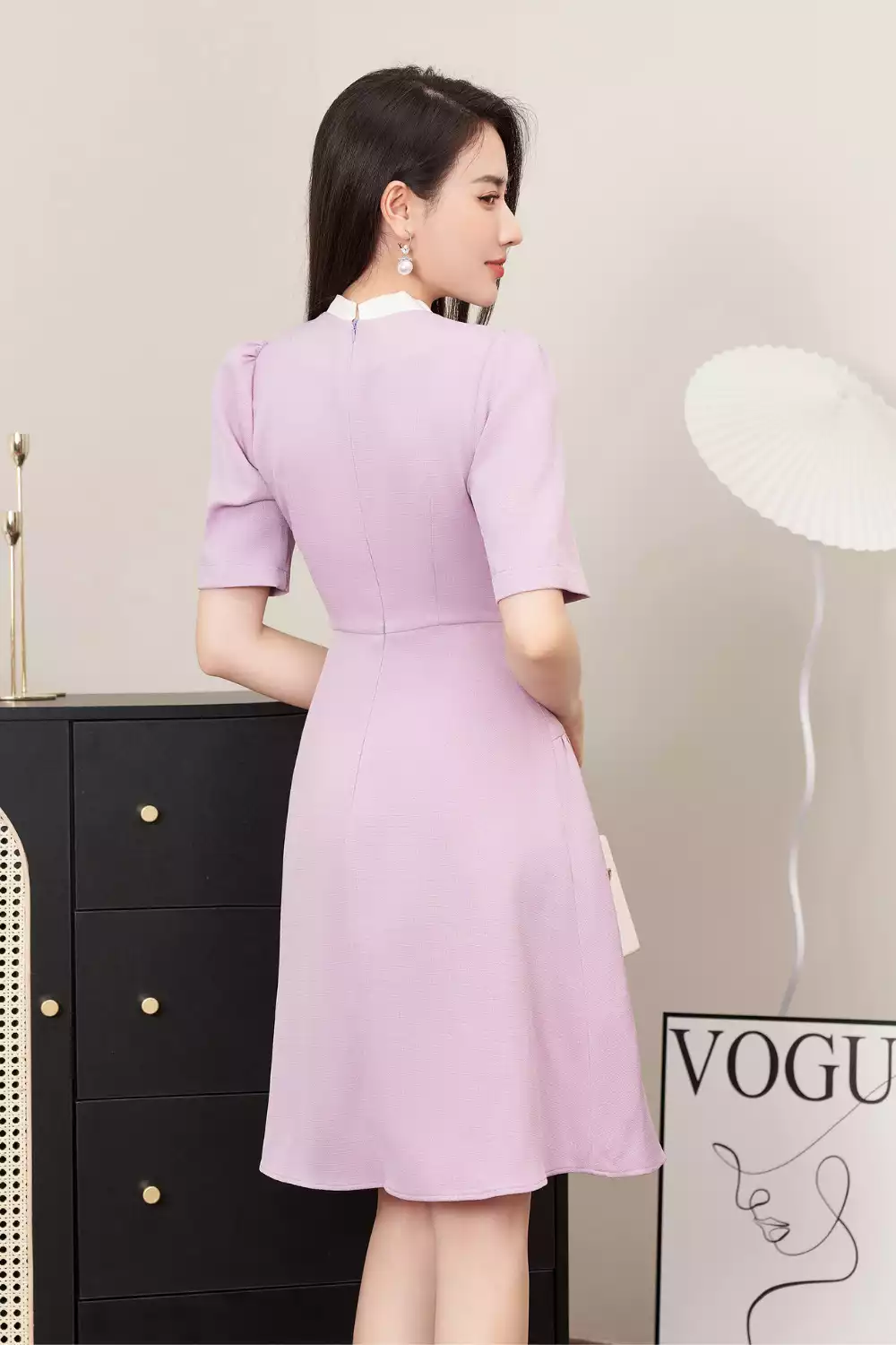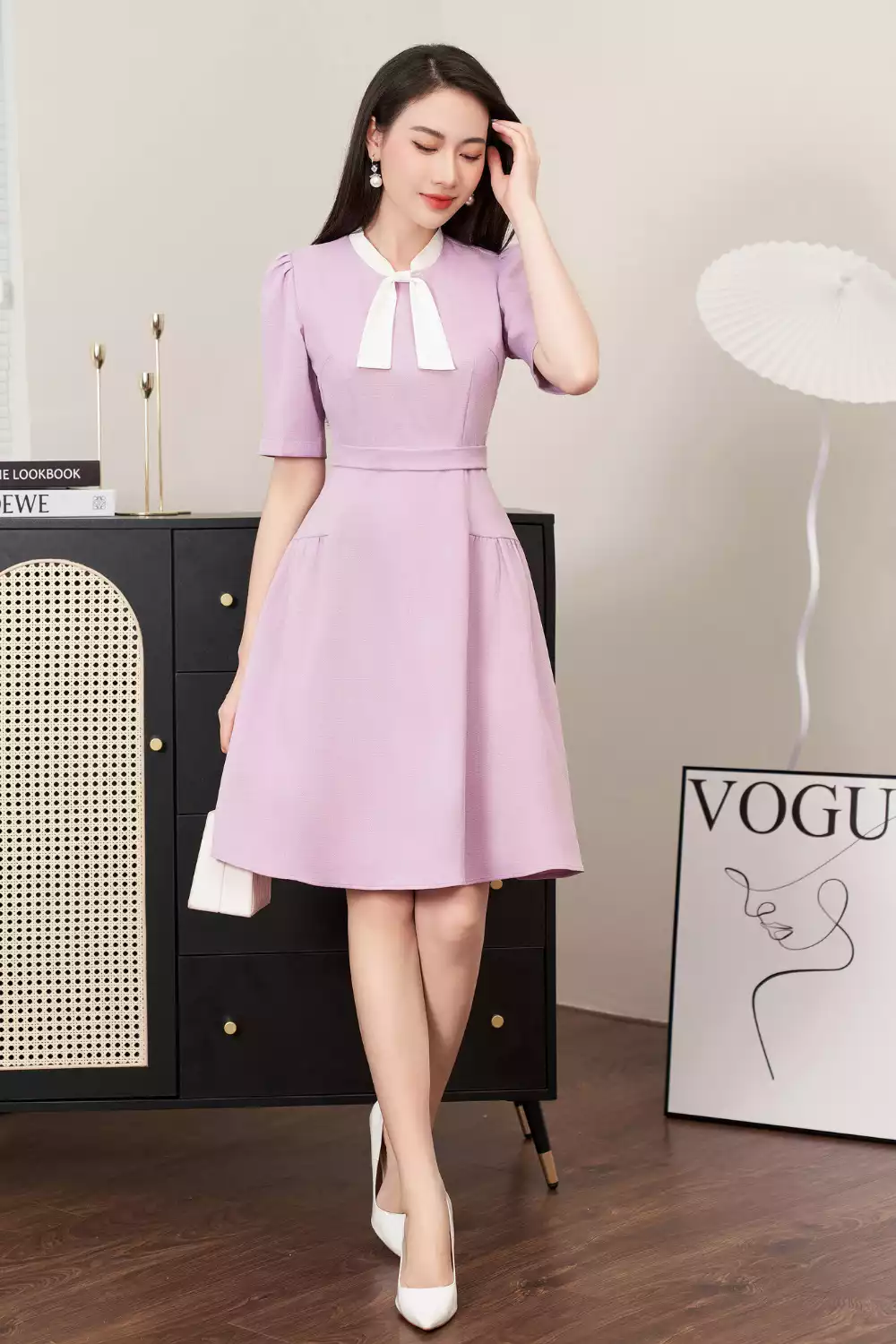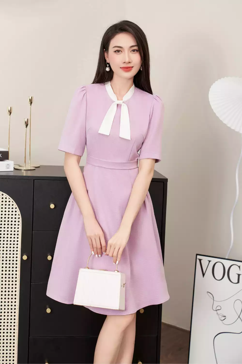 Đầm xòe dạ tím 1 màu tweed trắng cổ thắng nơ