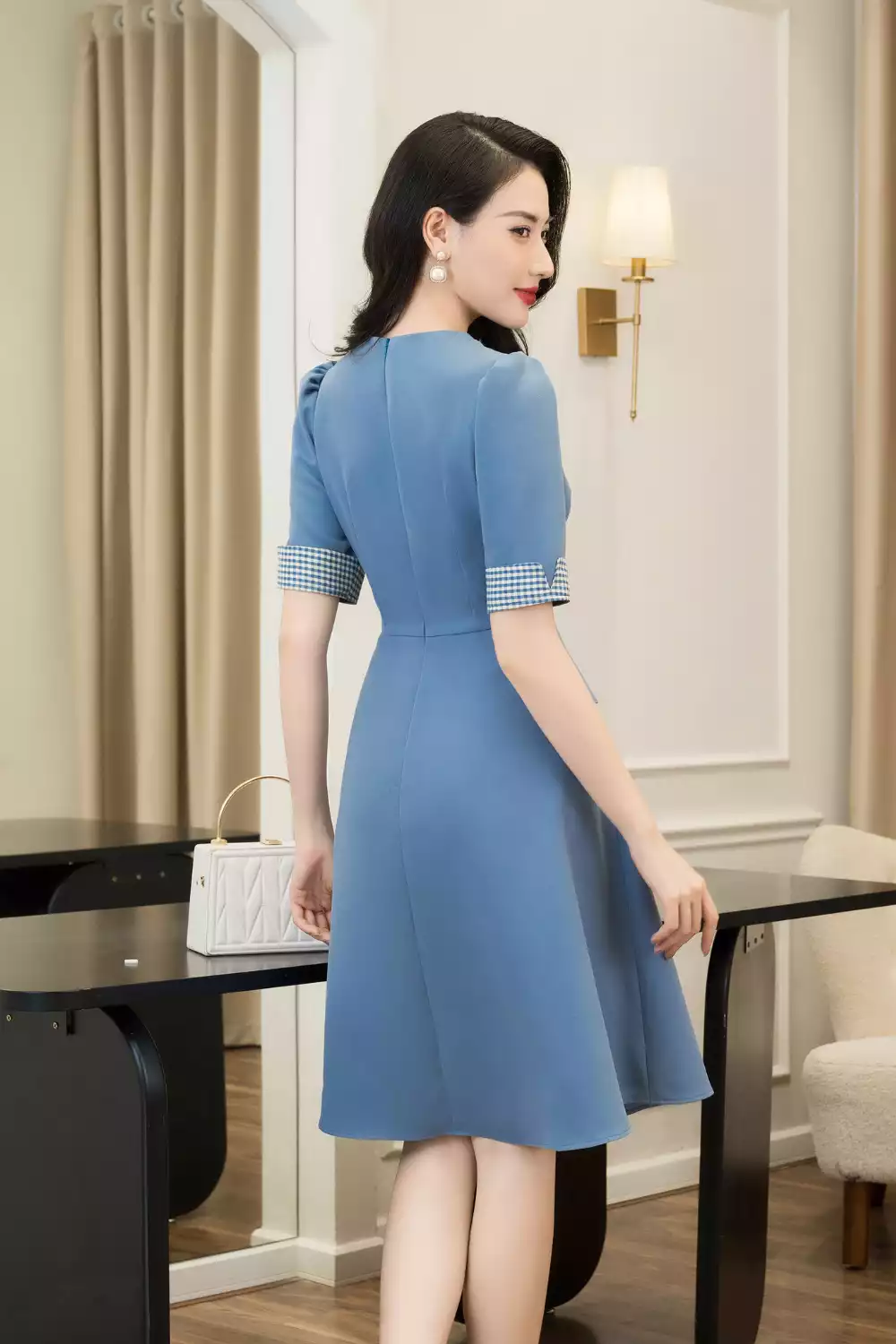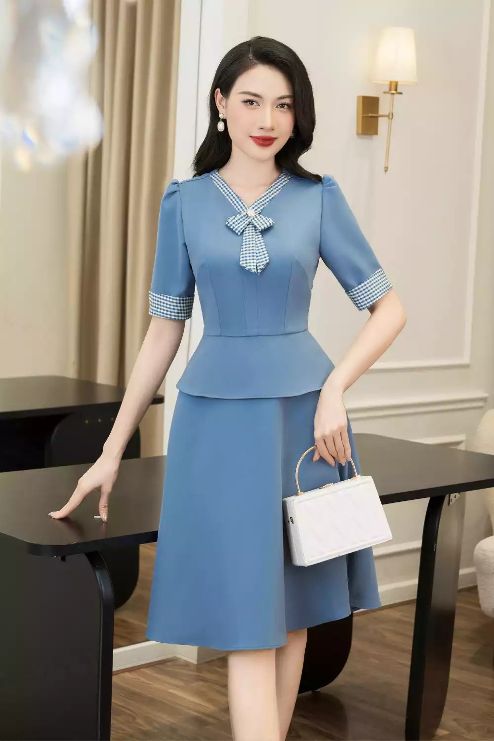 Đầm xoè peplum xanh phối cổ nơ kẻ