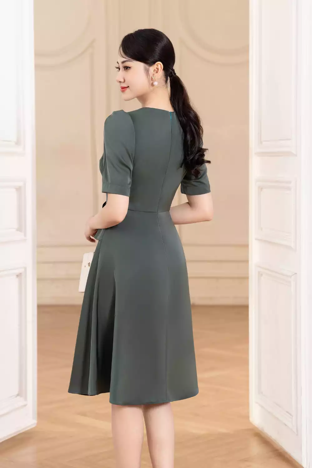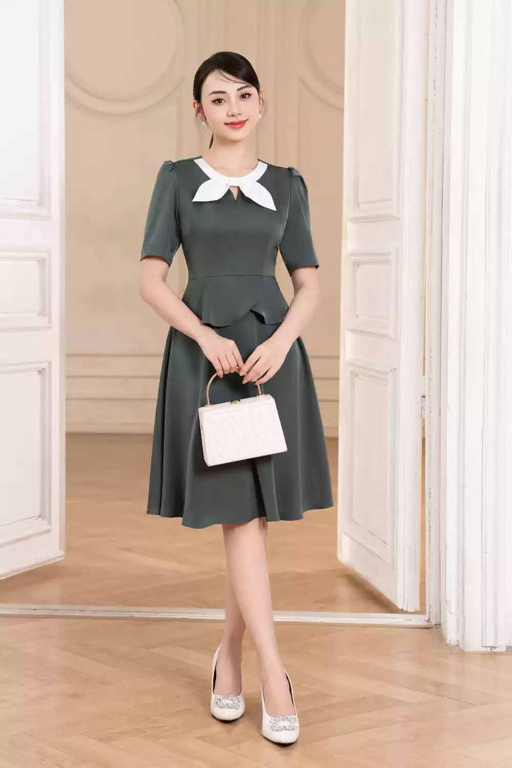 Đầm xoè peplum xanh tay lỡ phối nơ trắng