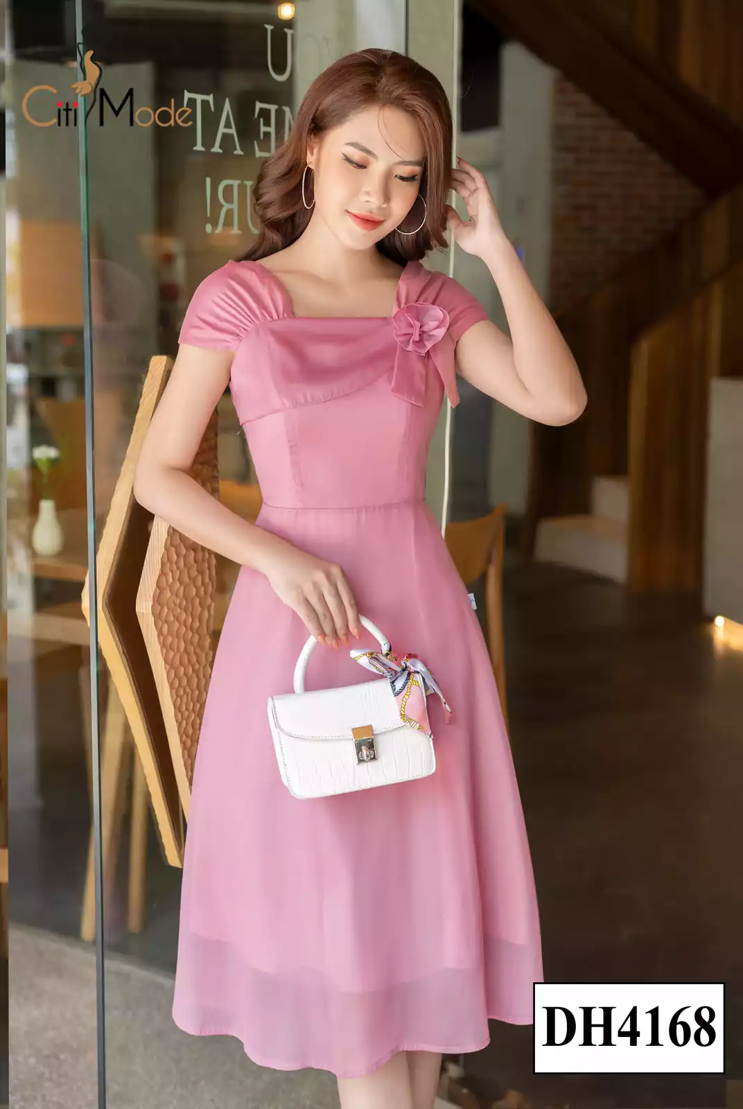 Đầm xòe tơ hồng tím đính hoa ngực